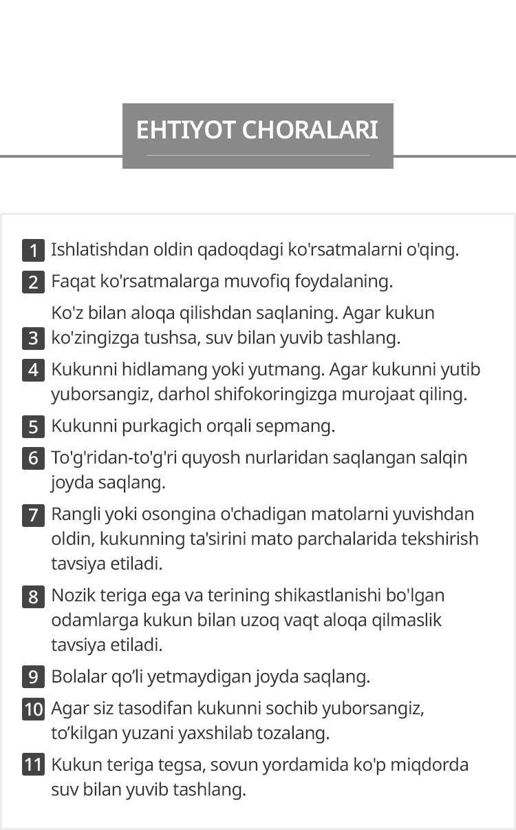 7. Agar mahsulot O‘zbekiston Respublikasi qonunchiligiga muvofiq qaytarilishi shart bo‘lmagan tovarlar toifasiga kirsa. (masalan, parfyumeriya va kosmetika va boshqalar)